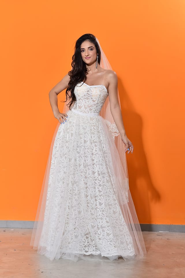 השילוב של שכבת התחרה האטובה עם שכבת הטול השקופה מעליה יוצר משחק מעניין של מרקמים ועומק. השמלה משתלבת באופן מושלם עם הינומה ארוכה ורכה, כפי שניתן לראות בתמונה, המשלימה את המראה המלכותי.
